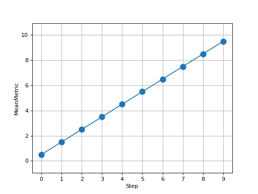 >>> # Example plotting multiple values >>> from torchmetrics.aggregation import MeanMetric >>> metric = MeanMetric() >>> values = [ ] >>> for i in range(10): ... values.append(metric([i, i+1])) >>> fig_, ax_ = metric.plot(values)