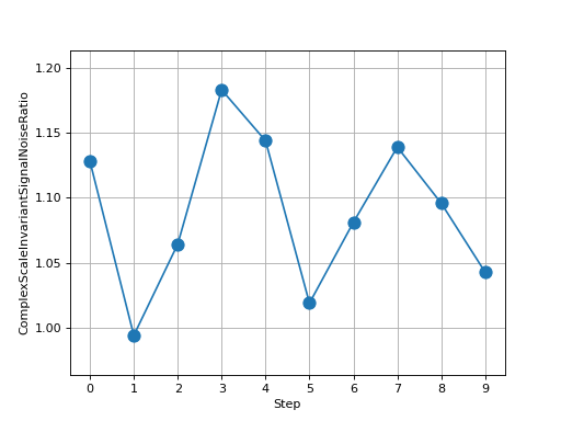>>> # Example plotting multiple values >>> import torch >>> from torchmetrics.audio import ComplexScaleInvariantSignalNoiseRatio >>> metric = ComplexScaleInvariantSignalNoiseRatio() >>> values = [ ] >>> for _ in range(10): ... values.append(metric(torch.rand(1,257,100,2), torch.rand(1,257,100,2))) >>> fig_, ax_ = metric.plot(values)