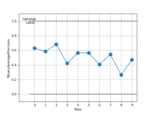 >>> # Example plotting multiple values >>> import torch >>> from torchmetrics.classification import BinaryAveragePrecision >>> metric = BinaryAveragePrecision() >>> values = [ ] >>> for _ in range(10): ... values.append(metric(torch.rand(20,), torch.randint(2, (20,)))) >>> fig_, ax_ = metric.plot(values)