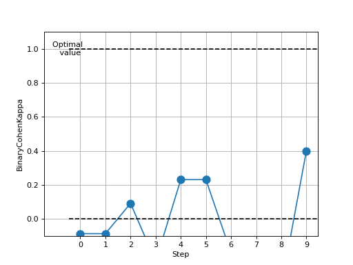 >>> from torch import rand, randint >>> # Example plotting multiple values >>> from torchmetrics.classification import BinaryCohenKappa >>> metric = BinaryCohenKappa() >>> values = [ ] >>> for _ in range(10): ... values.append(metric(rand(10), randint(2,(10,)))) >>> fig_, ax_ = metric.plot(values)