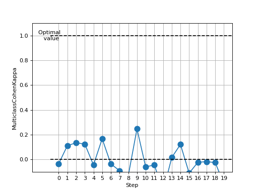 >>> from torch import randn, randint >>> # Example plotting a multiple values >>> from torchmetrics.classification import MulticlassCohenKappa >>> metric = MulticlassCohenKappa(num_classes=3) >>> values = [] >>> for _ in range(20): ... values.append(metric(randn(20,3).softmax(dim=-1), randint(3, (20,)))) >>> fig_, ax_ = metric.plot(values)
