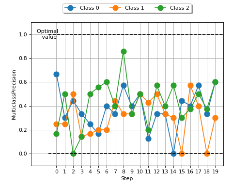 >>> from torch import randint >>> # Example plotting a multiple values per class >>> from torchmetrics.classification import MulticlassPrecision >>> metric = MulticlassPrecision(num_classes=3, average=None) >>> values = [] >>> for _ in range(20): ... values.append(metric(randint(3, (20,)), randint(3, (20,)))) >>> fig_, ax_ = metric.plot(values)