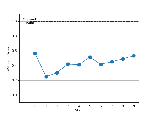>>> # Example plotting multiple values >>> import torch >>> from torchmetrics.clustering import VMeasureScore >>> metric = VMeasureScore() >>> values = [ ] >>> for _ in range(10): ... values.append(metric(torch.randint(0, 4, (10,)), torch.randint(0, 4, (10,)))) >>> fig_, ax_ = metric.plot(values)