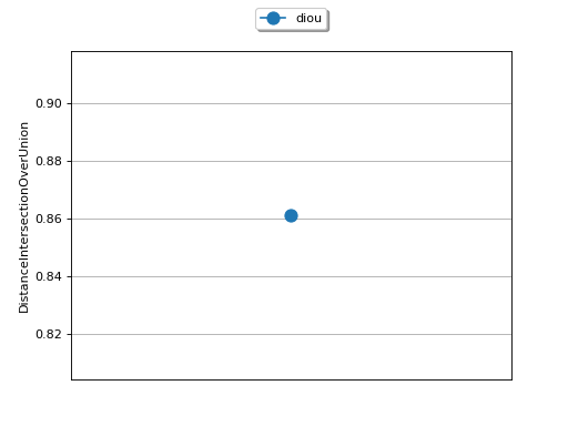 >>> # Example plotting single value >>> import torch >>> from torchmetrics.detection import DistanceIntersectionOverUnion >>> preds = [ ... { ... "boxes": torch.tensor([[296.55, 93.96, 314.97, 152.79], [298.55, 98.96, 314.97, 151.79]]), ... "scores": torch.tensor([0.236, 0.56]), ... "labels": torch.tensor([4, 5]), ... } ... ] >>> target = [ ... { ... "boxes": torch.tensor([[300.00, 100.00, 315.00, 150.00]]), ... "labels": torch.tensor([5]), ... } ... ] >>> metric = DistanceIntersectionOverUnion() >>> metric.update(preds, target) >>> fig_, ax_ = metric.plot()
