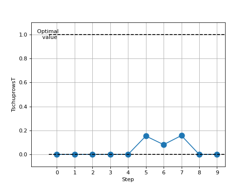 >>> # Example plotting multiple values >>> import torch >>> from torchmetrics.nominal import TschuprowsT >>> metric = TschuprowsT(num_classes=5) >>> values = [ ] >>> for _ in range(10): ... values.append(metric(torch.randint(0, 4, (100,)), torch.randint(0, 4, (100,)))) >>> fig_, ax_ = metric.plot(values)