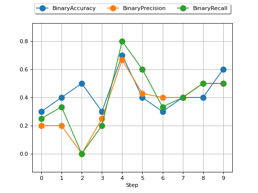 >>> # Example plotting multiple values >>> import torch >>> from torchmetrics import MetricCollection >>> from torchmetrics.classification import BinaryAccuracy, BinaryPrecision, BinaryRecall >>> metrics = MetricCollection([BinaryAccuracy(), BinaryPrecision(), BinaryRecall()]) >>> values = [] >>> for _ in range(10): ... values.append(metrics(torch.rand(10), torch.randint(2, (10,)))) >>> fig_, ax_ = metrics.plot(values, together=True)