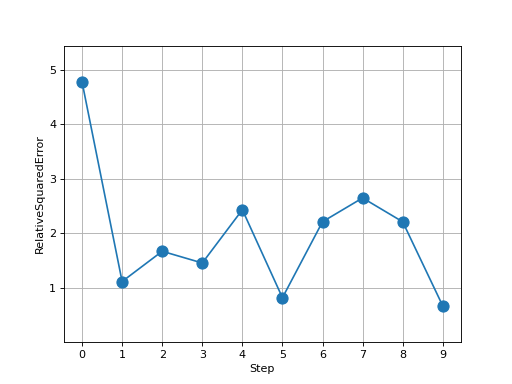 >>> from torch import randn >>> # Example plotting multiple values >>> from torchmetrics.regression import RelativeSquaredError >>> metric = RelativeSquaredError() >>> values = [] >>> for _ in range(10): ... values.append(metric(randn(10,), randn(10,))) >>> fig, ax = metric.plot(values)