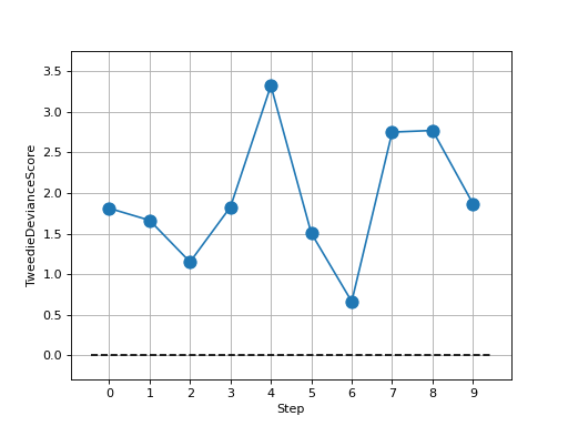 >>> from torch import randn >>> # Example plotting multiple values >>> from torchmetrics.regression import TweedieDevianceScore >>> metric = TweedieDevianceScore() >>> values = [] >>> for _ in range(10): ... values.append(metric(randn(10,), randn(10,))) >>> fig, ax = metric.plot(values)