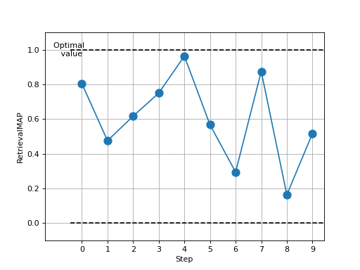 >>> import torch >>> from torchmetrics.retrieval import RetrievalMAP >>> # Example plotting multiple values >>> metric = RetrievalMAP() >>> values = [] >>> for _ in range(10): ... values.append(metric(torch.rand(10,), torch.randint(2, (10,)), indexes=torch.randint(2,(10,)))) >>> fig, ax = metric.plot(values)