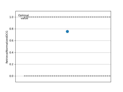>>> import torch >>> from torchmetrics.retrieval import RetrievalNormalizedDCG >>> # Example plotting a single value >>> metric = RetrievalNormalizedDCG() >>> metric.update(torch.rand(10,), torch.randint(2, (10,)), indexes=torch.randint(2,(10,))) >>> fig_, ax_ = metric.plot()