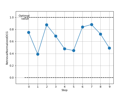 >>> import torch >>> from torchmetrics.retrieval import RetrievalNormalizedDCG >>> # Example plotting multiple values >>> metric = RetrievalNormalizedDCG() >>> values = [] >>> for _ in range(10): ... values.append(metric(torch.rand(10,), torch.randint(2, (10,)), indexes=torch.randint(2,(10,)))) >>> fig, ax = metric.plot(values)