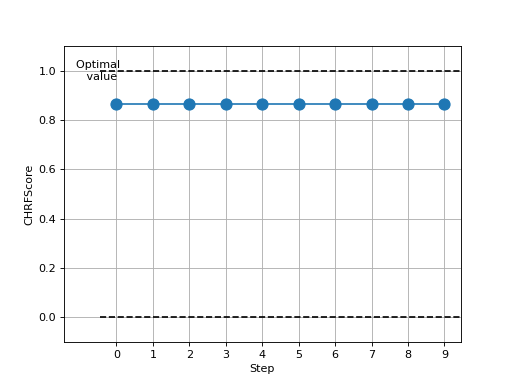 >>> # Example plotting multiple values >>> from torchmetrics.text import CHRFScore >>> metric = CHRFScore() >>> preds = ['the cat is on the mat'] >>> target = [['there is a cat on the mat', 'a cat is on the mat']] >>> values = [ ] >>> for _ in range(10): ... values.append(metric(preds, target)) >>> fig_, ax_ = metric.plot(values)