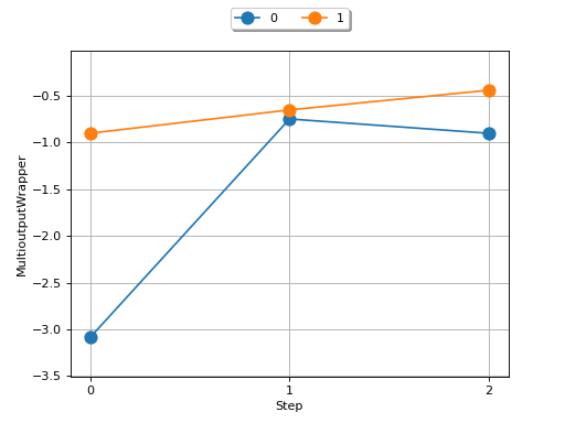 >>> # Example plotting multiple values >>> import torch >>> from torchmetrics.wrappers import MultioutputWrapper >>> from torchmetrics.regression import R2Score >>> metric = MultioutputWrapper(R2Score(), 2) >>> values = [ ] >>> for _ in range(3): ... values.append(metric(torch.randn(20, 2), torch.randn(20, 2))) >>> fig_, ax_ = metric.plot(values)
